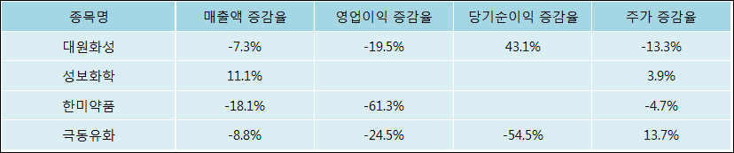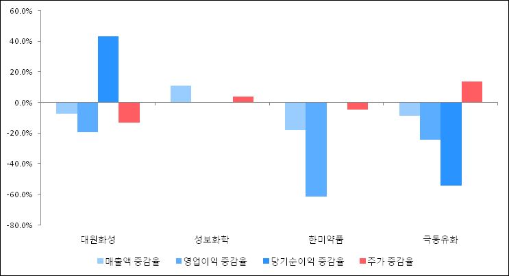 다음은 대원화성과 동일 업종 내 비교 그룹 종목의 각각 최근 실적의 전년 동기 대비 성장률이다. 대원화성의 매출액 증감율은 타 종목 대비 저조한 편이다. 그리고 주가의 하락율이 가장 큰 편으로 나타났다.