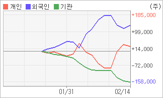 | 외국인/개인 순매수, 기관은 순매도(한달누적) 2월1일부터 기관이 14거래일 연속 순매도 행진을 벌이고 있다. 4주간을 기준으로 보면 외국인이 초반에 동종목을 순매수한 이후에 기세를 이어가며 132,517주를 순매수했고, 개인들도 매수반전의 모습을 보이며 25,391주를 순매수했다. 하지만 기관은 매도 관점으로 접근하면서 157,908주를 순매도했다. |