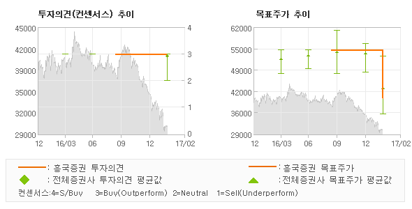 오늘 흥국증권에서 발표된 '매수(유지)'의견 및 목표주가 40,000원은 전체의견에 수렴하면서 시장의 평균적인 기대감이 비교적 객관적으로 표현된 것으로 풀이되며 목표가평균 대비 4.5%정도 미달하고 있는 것으로 집계되었다. 참고로 최근에 목표주가를 가장 공격적으로 제시한 한국투자증권에서 투자의견 '매수(유지)'에 목표주가 53,000원을 제일 보수적인 의견을 제시한 하나금융투자에서 투자의견 'NEUTRAL(하향)'에 목표주가 35,000원을 제시한 바 있다.