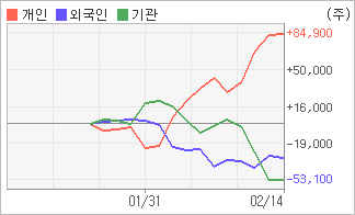 | 외국인과 기관은 순매도, 개인은 순매수(한달누적) 전일 기관이 278주를 순매수했고, 외국인은 2,180주를 순매도했다. 4주간을 기준으로 보면 외국인이 매도 우위를 지속하면서 32,095주를 순매도했고, 기관도 순매수에서 순매도로 반전되면서 52,737주를 순매도했지만, 개인은 오히려 매수반전의 모습을 보이며 84,832주를 순매수했다. |