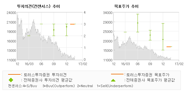 오늘 토러스투자증권에서 발표된 '매수'의견 및 목표주가 16,700원은 전체 컨센서스 대비해서 대체적으로 평균치에 해당하는 수준으로, 이번 의견은 동종목에 대한 전체적인 흐름에서 크게 벗어나지 않은 것으로 파악되며 목표가평균 대비 8.6%정도 미달하고 있는 것으로 집계되었다. 참고로 최근에 목표주가를 가장 공격적으로 제시한 골든브릿지투자증권에서 투자의견 '매수(유지)'에 목표주가 21,100원을 제시한 바 있다.