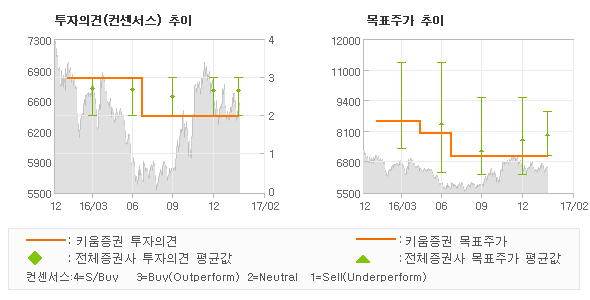 키움증권의 동종목에 대한 최근 1년동안의 투자의견은 전체적으로 조금 하향조정되고 있다. 목표주가는 2016년1월 8,500원까지 높아졌다가 2016년7월 7,000원을 최저점으로 목표가가 제시된 이후 최근에도 7,000원으로 제시되고 있다.