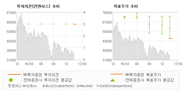 오늘 NH투자증권에서 발표된 '매수(신규)'의견 및 목표주가 51,000원은 전체 컨센서스 대비해서 대체적으로 평균치에 해당하는 수준으로, 이번 의견은 동종목에 대한 전체적인 흐름에서 크게 벗어나지 않은 것으로 파악되며 목표가평균 대비 16.4%정도 미달하고 있는 것으로 집계되었다. 참고로 최근에 목표주가를 가장 공격적으로 제시한 유진투자증권에서 투자의견 '매수(유지)'에 목표주가 72,100원을 제시한 바 있다.