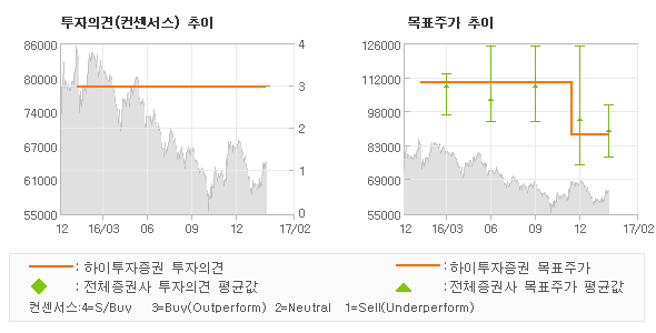 하이투자증권의 동종목에 대한 최근 1년동안의 투자의견은 전체적으로 큰 변화없이 유지되고 있다. 목표주가는 2016년2월 110,000원까지 높아졌다가 2016년12월 88,000원을 최저점으로 목표가가 제시된 이후 최근에도 88,000원으로 제시되고 있다.