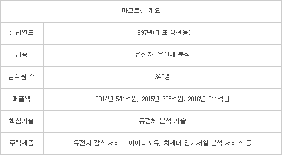 마크로젠은 서울대 의대 유전체이식연구소를 모태로 1997년에 설립됐다. 2000년 한국 바이오 벤처기업 최초로 코스닥에 등록했다. 현재 유전체와 의료정보 통합 빅데이터를 활용, 예측·진단·치료 등 정밀의학 기술 개발에 집중하고 있다.
