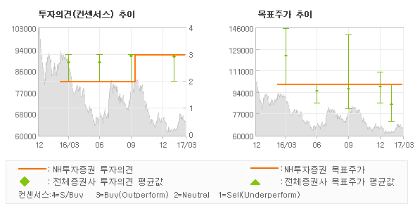 오늘 NH투자증권에서 발표된 '매수(유지)'의견 및 목표주가 100,000원은 전체 컨센서스 대비해서 대체적으로 평균치에 해당하는 수준으로, 이번 의견은 동종목에 대한 전체적인 흐름에서 크게 벗어나지 않은 것으로 파악되며 목표가평균 대비 18.2% 초과하고 있는 것으로 집계되었다. 참고로 최근 증권사 매매의견 중에서 제일 보수적인 의견을 제시한 대신증권에서 투자의견 '시장수익률(유지)'에 목표주가 70,000원을 제시한 바 있다.