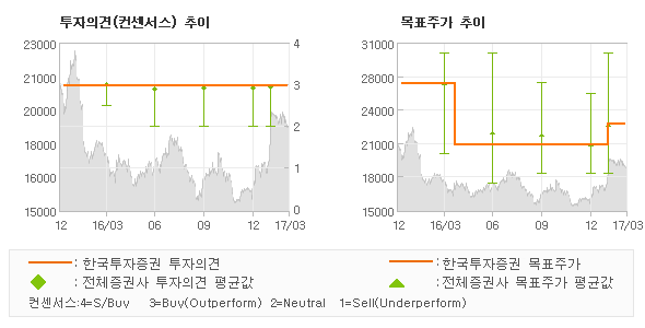한국투자증권의 동종목에 대한 최근 1년동안의 투자의견은 전체적으로 큰 변화없이 유지되고 있다. 목표주가는 2016년1월 27,000원까지 높아졌다가 2016년4월 21,000원을 최저점으로 목표가가 제시된 이후 최근에 23,000원으로 새롭게 조정되고 있다.