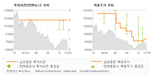 삼성증권의 동종목에 대한 최근 1년동안의 투자의견은 전체적으로 큰 변화없이 유지되고 있다. 목표주가는 2016년2월 170,000원까지 높아졌다가 2016년11월 85,000원을 최저점으로 목표가가 제시된 이후 최근에 90,000원으로 새롭게 조정되고 있다.