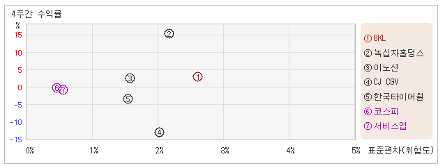 | 위험대비수익률 1.1, 업종지수보다 높아 3일 오후 12시55분 현재 전일대비 6.34% 하락하면서 19,950원을 기록하고 있는 GKL는 지난 1개월간 3.1% 상승했다. 같은 기간동안에 위험를 나타내는 지표인 표준편차는 2.6%를 기록했다. 이는 코스피 업종내에서 주요종목들과 비교해볼 때 GKL의 월간 주가수익률이 상당히 높았던 만큼 변동성도 상대적으로 매우 높은 수준을 유지했다는 뜻이다. 최근 1개월을 기준으로 GKL의 위험을 고려한 수익률은 1.1을 기록했는데, 변동성은 가장 높았으나 위험대비 수익률은 그렇게 높지 않다. 그럼에도 코스피업종의 위험대비수익률 -0.5보다는 높았기 때문에 업종대비 성과는 긍정적이라고 할 수 있다. 다음으로 업종과 시장을 비교해보면 GKL가 속해 있는 코스피업종은 서비스업지수보다 변동성은 낮고, 수익률은 높은 모습을 보여주고 있다. 즉, 업종등락률이 마이너스지만 지수에 비해서는 안전하게 선방하는 모습이라고 할 수 있다. |