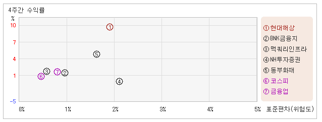 | 관련종목들 중에서 변동폭이 작아도 수익률은 높은 편 3일 오후 12시50분 현재 전일대비 2.47% 오른 33,250원을 기록하고 있는 현대해상은 지난 1개월간 9.74% 상승했다. 동기간 동안 주가의 변동성 지표인 표준편차는 1.9%를 기록했다. 이는 금융업 업종내에서 주요종목들과 비교해볼 때 현대해상의 월간 주가수익률이 가장 높았던 만큼 변동성도 상당히 높은 수준을 유지했다는 뜻이다. 최근 1개월을 기준으로 현대해상의 위험을 고려한 수익률은 5.1을 기록했는데, 변동성은 높았으나 주가수익률이 양호했기 때문에 위험대비 수익률도 높은 수준을 나타냈다. 뿐만아니라 금융업업종의 위험대비수익률인 0.8보다도 높기 때문에 업종대비 성과도 좋았다고 할 수 있다. 다음으로 업종과 시장을 비교해보면 현대해상이 속해 있는 금융업업종은 코스피지수보다 변동성과 수익률이 모두 높은 모습이다. 다시 말하면 동업종에 탄력이 붙으면서 지수대비 초과상승했다는 의미이다. |