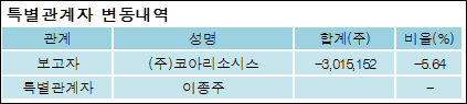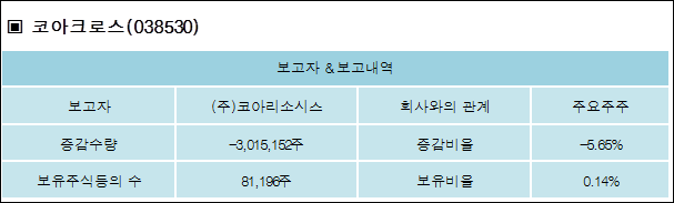 코아크로스(038530)는 03일 주요주주 (주)코아리소시스를 비롯한 특별관계자의 보유주식이 감소되었다고 발표했다. 이는 직전 보고일보다 3,015,152주 감소하여 지분율은 0.14%로 하락했다. 이번 보고 사유는 보고자의보통주매각으로 알려졌다.