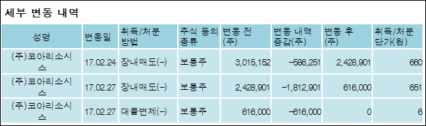 다음은 코아크로스의 지분 변동 내역과 보유 내역이다.