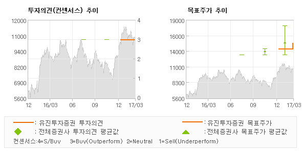 오늘 유진투자증권에서 발표된 '매수(유지)'의견 및 목표주가 15,000원은 전체의견에 수렴하면서 시장의 평균적인 기대감이 비교적 객관적으로 표현된 것으로 풀이되며 목표가평균 대비 2.2%정도 미달하고 있는 것으로 집계되었다. 참고로 최근에 목표주가를 가장 공격적으로 제시한 한화투자증권에서 투자의견 '매수(유지)'에 목표주가 18,000원을 제일 보수적인 의견을 제시한 하나금융투자에서 투자의견 '매수'에 목표주가 13,000원을 제시한 바 있다.