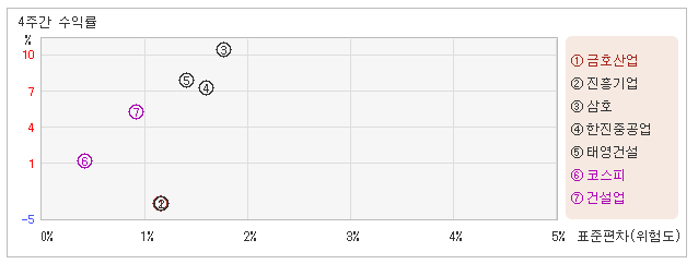 | 관련종목들과 비교해서 변동성이 커도 상승률은 낮은 편 6일 오전 10시35분 현재 전일대비 0.99% 상승한 9,140원으로 보합권에 머물러 있는 금호산업은 지난 1개월간 3.79% 하락했다. 같은 기간동안에 위험를 나타내는 지표인 표준편차는 1.1%를 기록했다. 이는 건설업 업종내에서 주요종목들과 비교해볼 때 금호산업의 월간 변동성은 작았지만, 주가가 마이너스를 기록하면서 주가등락률도 주요종목군 내에서 가장 낮은 수준을 유지했다는 것이다. 최근 1개월을 기준으로 금호산업의 위험을 고려한 수익률은 -3.4를 기록했는데, 변동성은 상대적으로 낮지만 주가가 약세를 보였기 때문에 위험대비 수익률은 가장 저조한 모습을 나타냈다. 게다가 건설업업종의 위험대비수익률 5.3보다도 낮기 때문에 업종대비 성과도 좋지 않았다고 할 수 있다. 다음으로 업종과 시장을 비교해보면 금호산업이 속해 있는 건설업업종은 코스피지수보다 변동성과 수익률이 모두 높은 모습이다. 다시 말하면 동업종에 탄력이 붙으면서 지수대비 초과상승했다는 의미이다. |