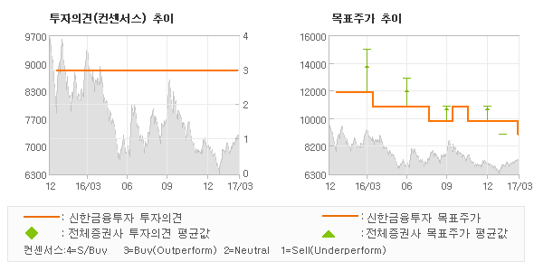 신한금융투자의 동종목에 대한 최근 1년동안의 투자의견은 전체적으로 큰 변화없이 유지되고 있다. 목표주가는 2016년4월 11,000원까지 높아졌다가 2016년8월 10,000원을 최저점으로 목표가가 제시된 이후 최근에 9,000원으로 새롭게 조정되고 있다.