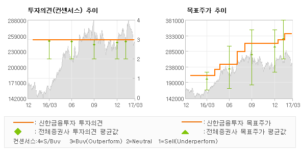신한금융투자의 동종목에 대한 최근 1년동안의 투자의견은 전체적으로 큰 변화없이 유지되고 있다. 목표주가는 2016년2월 210,000원이 저점으로 제시된 이후 이번에 발표된 340,000원까지 꾸준하게 상향조정되어 왔다.