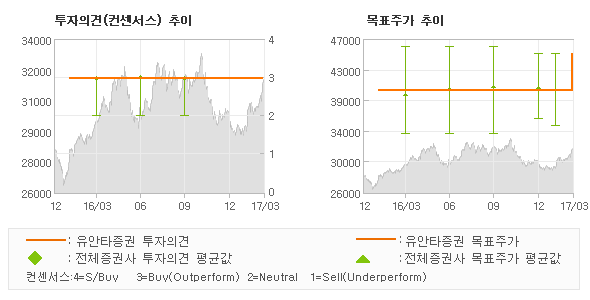 오늘 유안타증권에서 발표된 '매수(유지)'의견 및 목표주가 45,000원은 전체 컨센서스 대비해서 대체적으로 평균치에 해당하는 수준으로, 이번 의견은 동종목에 대한 전체적인 흐름에서 크게 벗어나지 않은 것으로 파악되며 목표가평균 대비 13.2% 초과하고 있는 것으로 집계되었다. 참고로 최근에 목표주가를 가장 공격적으로 제시한 동부증권에서 투자의견 '매수(유지)'에 목표주가 45,000원을 제일 보수적인 의견을 제시한 NH투자증권에서 투자의견 '매수(유지)'에 목표주가 35,000원을 제시한 바 있다.