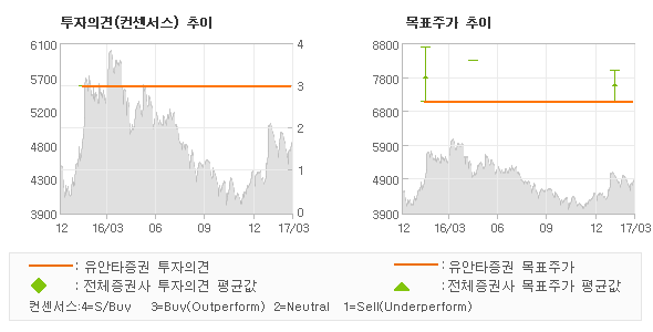 오늘 유안타증권에서 발표된 '매수(유지)'의견 및 목표주가 7,100원은 전체 컨센서스 대비해서 대체적으로 평균치에 해당하는 수준으로, 이번 의견은 동종목에 대한 전체적인 흐름에서 크게 벗어나지 않은 것으로 파악되며 목표가평균 대비 6%정도 미달하고 있는 것으로 집계되었다. 참고로 최근에 목표주가를 가장 공격적으로 제시한 키움증권에서 투자의견 '매수(유지)'에 목표주가 8,000원을 제시한 바 있다.