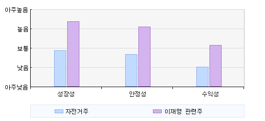 [수급주체 선호도] 같은 기간 수급적인 상황을 살펴봤을 때 자전거주 테마와 이재명 관련주 테마 모두 기관과 외국인이 순매수한 정도가 크지 않게 나타났다. 각 종목들의 누적 순매수금액을 더해보면 기관은 자전거주 테마 시가총액 대비 0.2% 정도의 작은 금액을 순매수하고 있다.