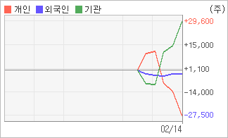 | 외국인과 개인은 순매도, 기관은 순매수(한달누적) 기관이 18일연속 순매수를 보이고 있는 반면에 외국인은 8일연속 순매도를 보이고 있다. 4주간을 기준으로 보면 기관이 29,526주를 순매수한 반면, 외국인은 매도 우위를 지속하면서 2,058주를 순매도했고, 개인들도 매도쪽으로 방향을 잡으면서 27,468주를 순매도했다. |