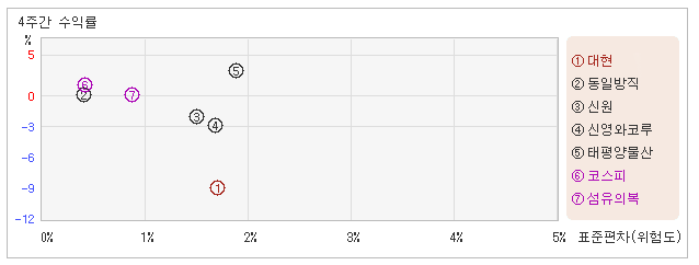| 관련종목들 중에서 변동폭이 커도 수익률은 낮은 편 10일 오전 10시50분 현재 전일대비 1.61% 하락하면서 3,065원을 기록하고 있는 대현은 지난 1개월간 11.42% 하락했다. 동기간 동안 주가의 변동성 지표인 표준편차는 1.7%를 기록했다. 이는 섬유의복 업종내에서 주요종목들과 비교해볼 때 대현의 월간 변동성이 상대적으로 커짐과 함께 주가도 마이너스를 보이며 낮은 수준을 유지했다는 뜻이다. 최근 1개월을 기준으로 대현의 위험을 고려한 수익률은 -6.7을 기록했는데, 변동성이 높고 주가는 약세를 기록하면서 위험대비 수익률은 가장 저조한 모습을 보였다. 게다가 섬유의복업종의 위험대비수익률 0.1보다도 낮기 때문에 업종대비 성과도 좋지 않았다고 할 수 있다. 다음으로 업종과 시장을 비교해보면 대현이 속해 있는 섬유의복업종은 코스피지수보다 변동성은 높고, 수익률은 낮은 모습을 보여주고 있다. 다시 말해서 동업종은 지수보다 크게 오르락 내리락 했지만, 상승률은 오히려 지수보다 못하다는 의미이다. |