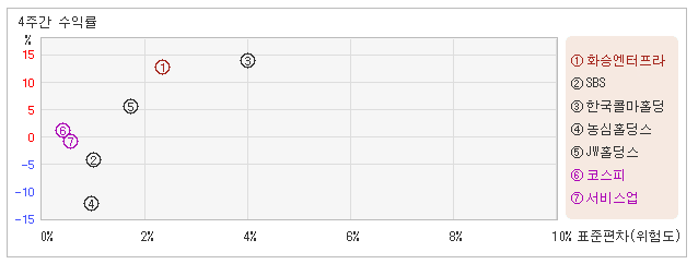 | 관련종목들과 비교해서 변동성이 작아도 상승률은 높은 편 10일 오전 11시25분 현재 전일대비 4.35% 오른 18,000원을 기록하고 있는 화승엔터프라이즈는 지난 1개월간 12.85% 상승했다. 같은 기간동안에 위험를 나타내는 지표인 표준편차는 2.3%를 기록했다. 이는 코스피 업종내에서 주요종목들과 비교해볼 때 화승엔터프라이즈의 월간 주가수익률이 상당히 높았던 만큼 변동성도 다소 높은 수준을 유지했다는 뜻이다. 최근 1개월을 기준으로 화승엔터프라이즈의 위험을 고려한 수익률은 5.5를 기록했는데, 변동성은 높았으나 주가수익률이 양호했기 때문에 위험대비 수익률도 높은 수준을 나타냈다. 뿐만아니라 코스피업종의 위험대비수익률인 3.5보다도 높기 때문에 업종대비 성과도 좋았다고 할 수 있다. 다음으로 업종과 시장을 비교해보면 화승엔터프라이즈가 속해 있는 코스피업종은 서비스업지수보다 변동성은 낮고, 수익률은 높은 모습을 보여주고 있다. 따라서 코스피업종에 투자하고 있다면 지수대비 안전하면서도 높은 상승률을 기록하고 있는 것이다. |