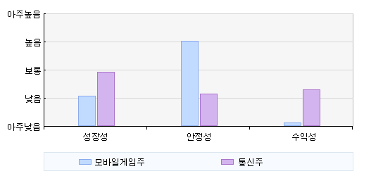 [테마 차트분석] 20일 동안의 테마들의 주가 움직임을 비교했을 때 모바일게임주 테마와 통신주 테마가 중장기에서 확실한 방향성을 보여주고 있지 않다.추세를 길게봤을 때는 유사한 모습을 하고 있는데, 두가지 테마들 전부 횡보하는 모습이 길어지고 있다. 반면, 추세를 짧게 봤을 때는 모바일게임주 테마가 하락세가 약해지는 긍정적인 모습을 나타내고 있고, 통신주 테마는 횡보하는 모습이 계속되고 있다. 20일 이격도 측면에서 두 테마 모두 정상범위를 벗어나지 않고 있다.
