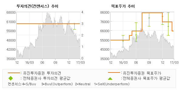 유진투자증권의 동종목에 대한 최근 1년동안의 투자의견은 전체적으로 큰 변화없이 유지되고 있다. 목표주가는 2016년2월 55,000원이 저점으로 제시된 이후 2016년8월 85,000원을 최고점으로 목표가가 제시되었고 최근에는 65,000원으로 다소 하향조정되고 있다.