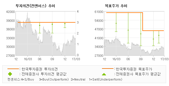 한국투자증권의 동종목에 대한 최근 1년동안의 투자의견은 전체적으로 큰 변화없이 유지되고 있다. 목표주가는 2016년4월 60,000원까지 높아졌다가 2016년10월 46,000원을 최저점으로 목표가가 제시된 이후 최근에도 46,000원으로 제시되고 있다.
