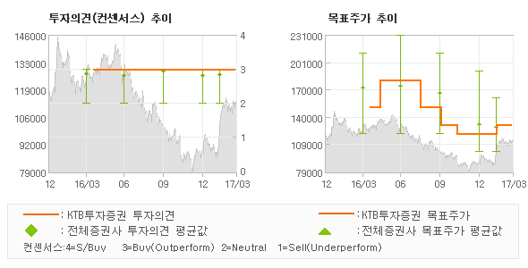 KTB투자증권의 동종목에 대한 최근 3개월 동안의 투자의견은 전체적으로 큰 변화없이 유지되고 있다. 목표주가는 2016년5월 180,000원까지 높아졌다가 2016년11월 120,000원을 최저점으로 목표가가 제시된 이후 최근에 130,000원으로 새롭게 조정되고 있다.