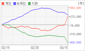 | 외국인/개인 순매수, 기관은 순매도(한달누적) 전일까지 외국인이 2일 연속, 기관이 6일 연속 각각 동종목을 순매도 했다. 4주간을 기준으로 보면 외국인이 매수 우위를 유지하면서 325,808주를 순매수했고, 개인들도 매수반전의 모습을 보이며 273,592주를 순매수했다. 하지만 기관은 매도 관점으로 접근하면서 599,400주를 순매도했다. |