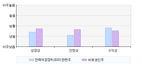 [테마 차트분석] 최근 20일 간 두 테마들의 움직임을 분석해보면 전력저장장치(ESS)관련주 테마와 비트코인주 테마가 모두 추세적인 모습은 두드러지지 않고 있는데, 전체적으로 비슷한 모습을 연출하고 있다. 중장기적으로는 횡보하는 모습이 길어지고 있는데, 단기적으로도 횡보하는 모습에서 특별한 변화가 나타나지 않고 있다. 20일 이격도 기준으로 두 테마 모두 정상범위를 벗어나지 않고 있다.