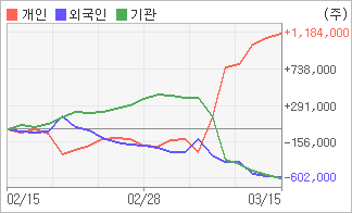 | 외국인과 기관은 순매도, 개인은 순매수(한달누적) 기관과 외국인의 동반 순매도가 눈에 띈다. 어제까지 기관은 9일 연속 동종목을 매도했고, 외국인도 6일 연속 순매도로 대응하고 있다. 4주간을 기준으로 보면 외국인이 매도 우위를 지속하면서 582,397주를 순매도했고, 기관도 순매수에서 순매도로 반전되면서 601,280주를 순매도했지만, 개인은 오히려 매수반전의 모습을 보이며 1,183,677주를 순매수했다. |