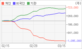 | 외국인/기관 순매수, 개인은 순매도(한달누적) 3월14일부터 전일까지 기관이 2거래일 연속 순매수했다. 4주간을 기준으로 보면 외국인이 초반에 동종목을 순매수한 이후에 기세를 이어가며 433,337주를 순매수했고, 기관도 방향성있는 매매를 하면서 661,224주를 순매수했다. 반면 개인들은 매도쪽으로 방향을 잡으면서 1,094,561주를 순매도한 것으로 나타났다. |