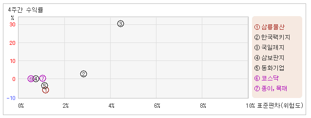 | 삼륭물산 | 동화기업 | 한국팩키지 | 삼보판지 | 국일제지 | |