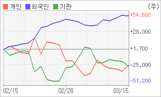 | 기관과 개인은 순매도, 외국인은 순매수(한달누적) 3월13일부터 전일까지 기관이 3거래일 연속 순매도를 보였다. 4주간을 기준으로 보면 외국인이 초반에 동종목을 순매수한 이후에 기세를 이어가며 53,143주를 순매수한 반면, 기관은 매도 우위를 보이면서 27,452주를 순매도했고, 개인들도 매도쪽으로 방향을 잡으면서 25,691주를 순매도한 것으로 집계됐다. |