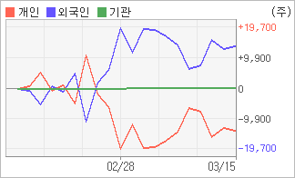 | 외국인/기관 순매수, 개인은 순매도(한달누적) 3월15일부터 전일까지 외국인이 2거래일 연속 순매수를 보였다. 4주간을 기준으로 보면 외국인이 초반에 동종목을 순매수한 이후에 기세를 이어가며 13,718주를 순매수했고, 기관도 초반에 동종목을 순매수한 이후에 큰 변화가 나타나지 않음에도 불구하고 1주를 순매수했다. 반면 개인들은 매도쪽으로 방향을 잡으면서 13,719주를 순매도한 것으로 나타났다. |
