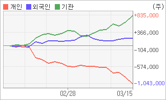 | 외국인/기관 순매수, 개인은 순매도(한달누적) 기관이 3일연속 순매수를 보이고 있는 반면에 외국인은 2일연속 순매도를 보이고 있다. 4주간을 기준으로 보면 외국인이 초반에 동종목을 순매수한 이후에 기세를 이어가며 207,569주를 순매수했고, 기관도 방향성있는 매매를 하면서 834,749주를 순매수했다. 반면 개인들은 매도쪽으로 방향을 잡으면서 1,042,318주를 순매도한 것으로 나타났다. |