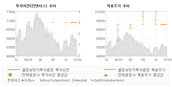 오늘 골든브릿지투자증권에서 발표된 '매수(유지)'의견 및 목표주가 85,000원은 전체 컨센서스 대비해서 대체적으로 평균치에 해당하는 수준으로, 이번 의견은 동종목에 대한 전체적인 흐름에서 크게 벗어나지 않은 것으로 파악되며 목표가평균과 대비해서 미미한 차이가 나는 것으로 집계되었다. 참고로 최근 증권사 매매의견 중에서 제시한 바 있다.