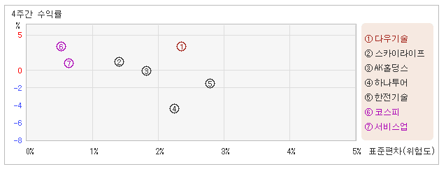 | 관련종목들 중에서 변동폭이 작아도 수익률은 높은 편 20일 오후 12시5분 현재 전일대비 2.88% 오른 19,650원을 기록하고 있는 다우기술은 지난 1개월간 3.42% 상승했다. 동기간 동안 주가의 변동성 지표인 표준편차는 2.3%를 기록했다. 이는 코스피 업종내에서 주요종목들과 비교해볼 때 다우기술의 월간 주가수익률이 가장 높았던 만큼 변동성도 상당히 높은 수준을 유지했다는 뜻이다. 최근 1개월을 기준으로 다우기술의 위험을 고려한 수익률은 1.4를 기록했는데, 변동성은 높았으나 주가수익률이 양호했기 때문에 위험대비 수익률도 높은 수준을 나타냈다. 다만 코스피업종의 위험대비수익률인 6.8보다는 낮기 때문에 업종대비 성과가 좋았다고는 할 수 없다. 다음으로 업종과 시장을 비교해보면 다우기술이 속해 있는 코스피업종은 서비스업지수보다 변동성은 낮고, 수익률은 높은 모습을 보여주고 있다. 따라서 코스피업종에 투자하고 있다면 지수대비 안전하면서도 높은 상승률을 기록하고 있는 것이다. |