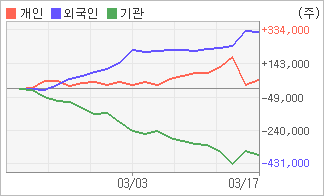 | 외국인/개인 순매수, 기관은 순매도(한달누적) 3월14일부터 전일까지 외국인이 4거래일 연속 순매수를 보였다. 4주간을 기준으로 보면 외국인이 초반에 동종목을 순매수한 이후에 기세를 이어가며 325,505주를 순매수했고, 개인들도 순매수량을 늘리며 48,933주를 순매수했다. 하지만 기관은 매도 관점으로 접근하면서 374,438주를 순매도했다. |