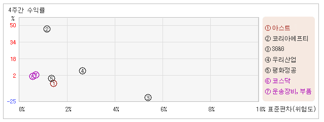 | 관련종목들 가운데 변동폭 커도 수익율은 낮아 20일 오후 12시55분 현재 전일대비 1.27% 오른 16,000원을 기록하고 있는 아스트는 지난 1개월간 8.57% 하락했다. 같은 기간동안 변동성의 크기를 말해주는 표준편차는 1.4%를 기록했다. 이는 운송장비,부품 업종내에서 주요종목들과 비교해볼 때 아스트의 월간 변동성은 주요종목군 내에서 중간 수준이었으나 주가등락률은 상대적으로나 절대적으로 낮은 수준을 유지했다는 것이다. 최근 1개월을 기준으로 아스트의 위험을 고려한 수익률은 -6.1을 기록했는데, 주가 약세와 더불어 위험대비 수익률도 부진을 면치 못했다. 게다가 운송장비,부품업종의 위험대비수익률 0.7보다도 낮기 때문에 업종대비 성과도 좋지 않았다고 할 수 있다. 다음으로 업종과 시장을 비교해보면 아스트가 속해 있는 운송장비,부품업종은 코스닥지수보다 변동성과 수익률이 모두 높은 모습이다. 다시 말하면 동업종에 탄력이 붙으면서 지수대비 초과상승했다는 의미이다. |