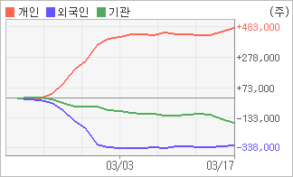 | 외국인과 기관은 순매도, 개인은 순매수(한달누적) 기관이 2일연속 주식을 팔고 있는 반면 외국인은 2일연속 주식을 사고 있다. 4주간을 기준으로 보면 외국인이 매도 후 매수의 관점을 보이고 있음에도 불구하고 316,865주를 순매도했고, 기관도 매도 관점으로 접근하면서 165,580주를 순매도했지만, 개인은 오히려 순매수량을 늘리며 482,445주를 순매수했다. |