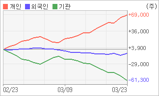 | 외국인과 기관은 순매도, 개인은 순매수(한달누적) 3월22일부터 전일까지 기관이 2거래일 연속 순매도를 보였다. 4주간을 기준으로 보면 외국인이 매도 우위를 지속하면서 7,690주를 순매도했고, 기관도 매도 관점으로 접근하면서 61,281주를 순매도했지만, 개인은 오히려 순매수량을 늘리며 68,971주를 순매수했다. |