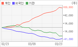 | 외국인과 기관은 순매도, 개인은 순매수(한달누적) 기관이 4일연속 주식을 팔고 있는 반면 외국인은 2일연속 주식을 사고 있다. 4주간을 기준으로 보면 외국인이 매도 우위를 지속하면서 38,483주를 순매도했고, 기관도 매도 관점으로 접근하면서 29,405주를 순매도했지만, 개인은 오히려 순매수량을 늘리며 67,888주를 순매수했다. |