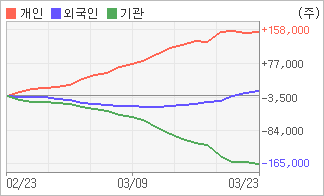 | 외국인/개인 순매수, 기관은 순매도(한달누적) 3월13일부터 외국인들이 9거래일 연속 순매수 행진을 벌이고 있다. 4주간을 기준으로 보면 외국인이 매매관점을 매도에서 매수로 전환하면서 11,244주를 순매수했고, 개인들도 순매수량을 늘리며 153,500주를 순매수했다. 하지만 기관은 매도 관점으로 접근하면서 164,744주를 순매도했다. |