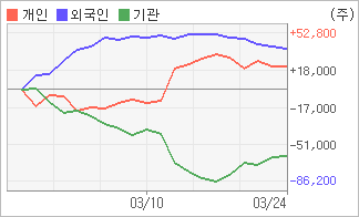 | 외국인/개인 순매수, 기관은 순매도(한달누적) 기관이 2일연속 순매수를 보이고 있는 반면에 외국인은 6일연속 순매도를 보이고 있다. 4주간을 기준으로 보면 외국인이 매수 우위를 유지하면서 39,054주를 순매수했고, 개인들도 매수반전의 모습을 보이며 22,510주를 순매수했다. 하지만 기관은 매도 관점으로 접근하면서 61,564주를 순매도했다. |