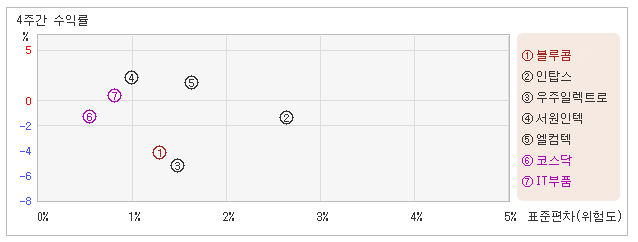 | 업종평균과 비교해서 변동폭 대비 수익률은 다소 부정적 27일 오후 2시35분 현재 전일대비 1.48% 하락하면서 10,000원을 기록하고 있는 블루콤은 지난 1개월간 5.21% 하락했다. 같은 기간동안에 위험정도를 말해주는 표준편차는 1.2%를 기록했다. 이는 IT부품 업종내에서 주요종목들과 비교해볼 때 블루콤의 월간 변동성이 작았던 만큼 주가등락률도 상대적으로 낮았다는 것을 의미한다. 최근 1개월을 기준으로 블루콤의 위험을 고려한 수익률은 -4.3을 기록했는데, 변동성은 상대적으로 낮지만 주가가 약세를 보였기 때문에 위험대비 수익률은 부진한 모습을 나타냈다. 게다가 IT부품업종의 위험대비수익률인 0.6보다도 낮기 때문에 업종대비 성과도 긍정적이라고 할 수 없다. 다음으로 업종과 시장을 비교해보면 블루콤이 속해 있는 IT부품업종은 코스닥지수보다 변동성과 수익률이 모두 높은 모습이다. 다시 말하면 동업종에 탄력이 붙으면서 지수대비 초과상승했다는 의미이다. |