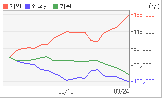 | 외국인과 기관은 순매도, 개인은 순매수(한달누적) 3월20일부터 전일까지 기관과 외국인 모두 5거래일연속 동종목을 내다 팔았다. 4주간을 기준으로 보면 외국인이 매도 우위를 지속하면서 107,946주를 순매도했고, 기관도 매도 관점으로 접근하면서 77,126주를 순매도했지만, 개인은 오히려 순매수량을 늘리며 185,072주를 순매수했다. |