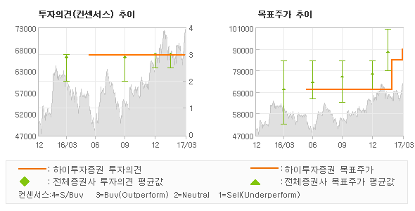 하이투자증권의 동종목에 대한 최근 6개월 동안의 투자의견은 전체적으로 큰 변화없이 유지되고 있다. 목표주가는 85,000원이 고점으로, 반대로 70,000원이 저점으로 제시된 이후 이번에 90,000수준으로 새롭게 조정되고 있다.